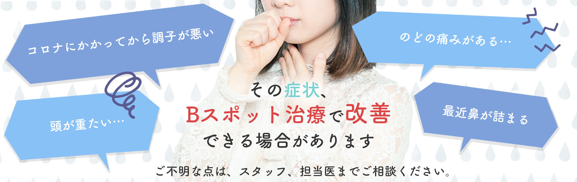 いびき、咳が止まらない、扁桃炎、流行り風邪などの症状を改善し、健康的な発声や飲み込みをサポートします。上咽頭の治療のBスポット療法も行っております。