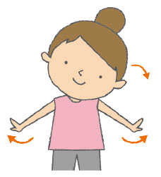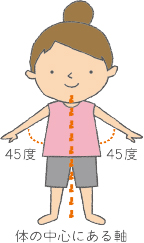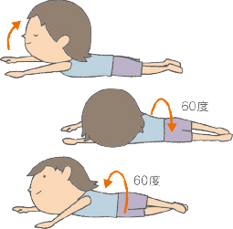 ❷ 息を吐きながら、体の軸を中心にゆっくりと右へ60度回転し、息を吸いながら元に戻る ※❶〜❸を1セットとし、1日に1〜2セット行う |