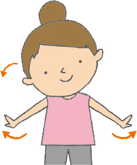 ❶ 両足を肩幅程度に開いて立つ。両腕を45度の角度で広げ、両手首を可能な限り上に反らせる |