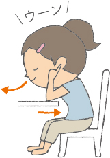 ❶ イスに座ってテーブルに両ひじをつき、上体を前に傾ける。手の人差し指を両耳の中に浅く入れ、目を閉じる