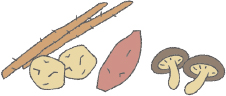 ゴボウ、寒天、イモ類、キノコ類など |