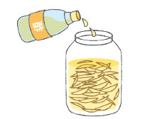 しょうゆとみりんと酢を大さじ6ずつ、好みで細切りにしたコンブを保存容器に入れる。