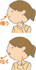 ❷ おなかがふくらむのを意識しながら、鼻から息をスッと短く吸う ❸ 小さな低い声で「ウーン」といい続けながら、おなかをヘこませるようにして、鼻から息をゆっくり長く吐く |