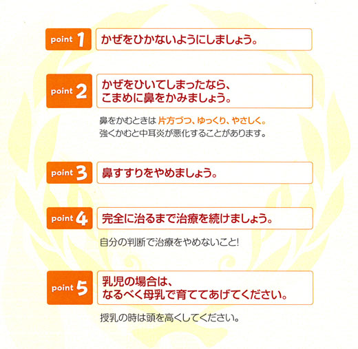 鼻をすすったり、両方の鼻をつまんで鼻をかむ癖がある場合は鼻の菌が耳に入りやすいためです。