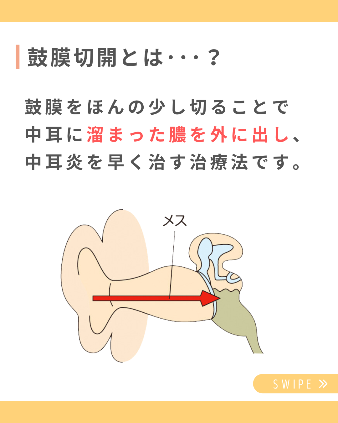 鼓膜をほんの少し切ることで中耳に溜まった膿を外に出し、